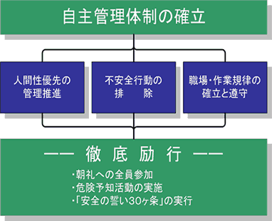 自主管理体制の確立のためには、人間性優先の管理推進、不安全行動の排除、職場・作業規律の確立と遵守が不可欠であり、これらを効果的に進めるには、朝礼への全員参加、危険予知活動の実施、弊社の定める「安全の誓い30ヶ条」の実行などの日々の積み重ねが大切であると考えています。
